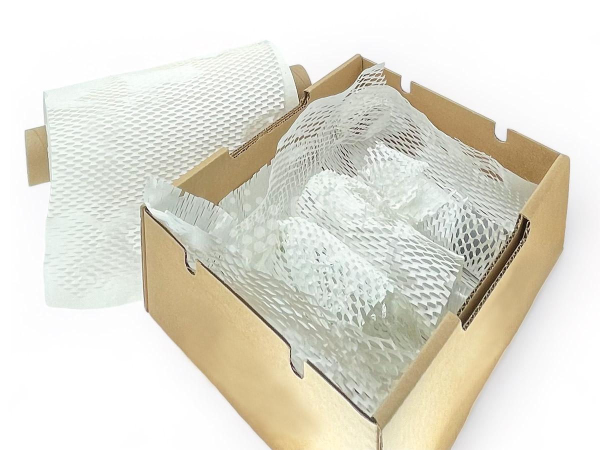 Blending strength and delicacy, this innovative protective paper fuses the durability of Kraft paper with the softness of tissue paper, offering an efficient shield for fragile items such as glassware. The honeycomb design guarantees exceptional flexibility and expansion in all directions, ensuring complete coverage. Importantly, this eco-friendly solution is fully recyclable, adhering to sustainable packaging practices.